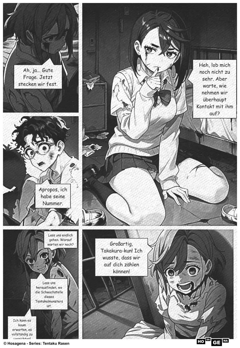 Dieser Ausschnitt stammt aus dem Manga Dandadan, altersbeschränkte Version, Staffel 1, Episode 1, Kapitel 1, Seite 13. Momo saß auf dem Boden eines zerstörten Krankenzimmers, ihre Kleidung war zerrissen und ihr Gesicht von blauen Flecken gezeichnet. Mit ruhiger, aber besorgter Stimme fragte sie, wie sie jemanden kontaktieren könnten, der möglicherweise helfen kann. Trotz seiner Verletzungen antwortete Okarun sofort, dass er die Nummer dieser Person habe. Seine Antwort brachte einen kurzen Moment der Erleichterung inmitten der angespannten Lage. Die drei befanden sich offenbar in einer verzweifelten Situation, umgeben von Zerstörung und den Überresten eines vorherigen Kampfes.